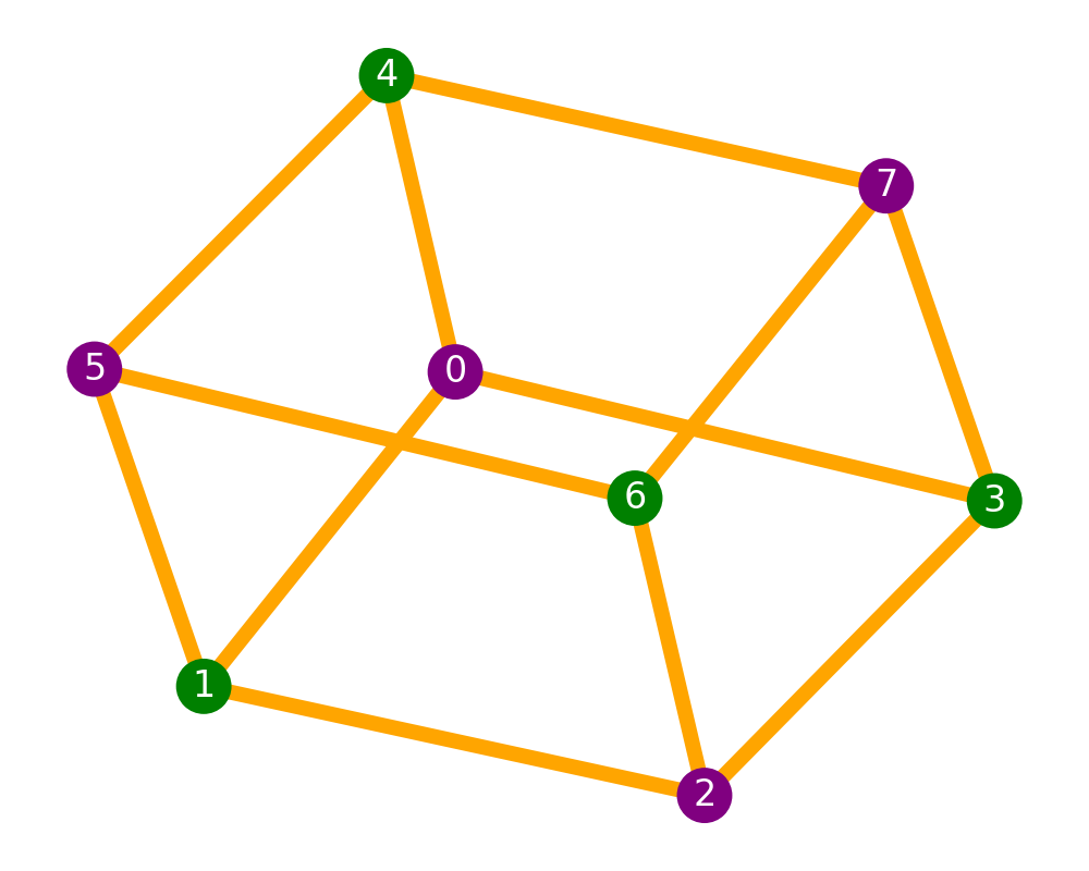 Fig. 5 Graph for the example maxcut problem. The green and purple vertices indicate one of two optimal vertex partitioning.