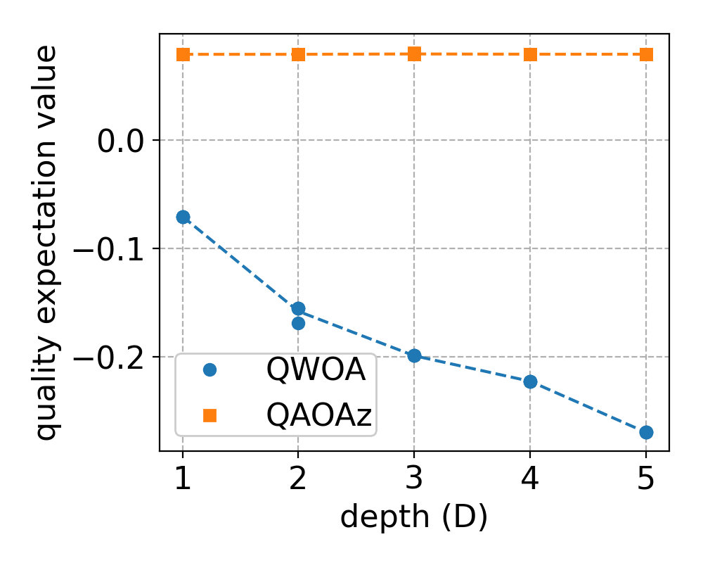 Fig. 7 Final objective function value achieved by the QAOAz and the QWOA for a portfolio optimisation problem with 4 assets from ansatz depths 1 to 5. each point depicts the average of three repeats.